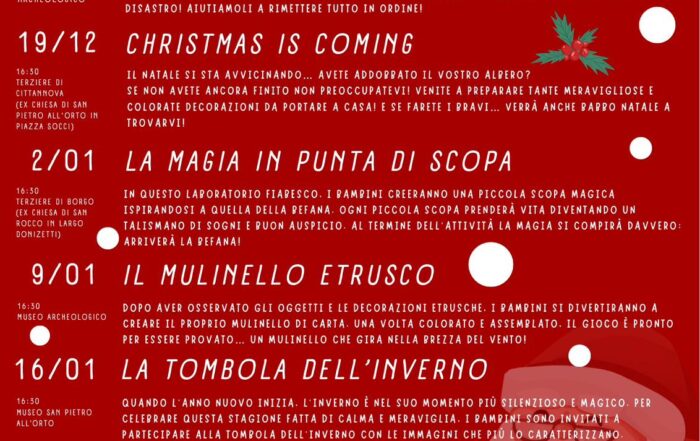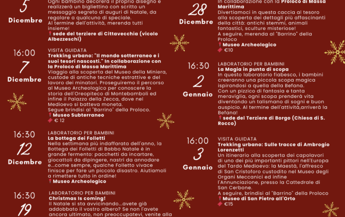 Anche per questo anno i Musei di Massa Marittima propongono un ricco calendario di iniziative dedicate al periodo natalizio. Natale al Museo offre un insieme di attività pensate per coinvolgere famiglie, bambini, cittadini e visitatori, [...]